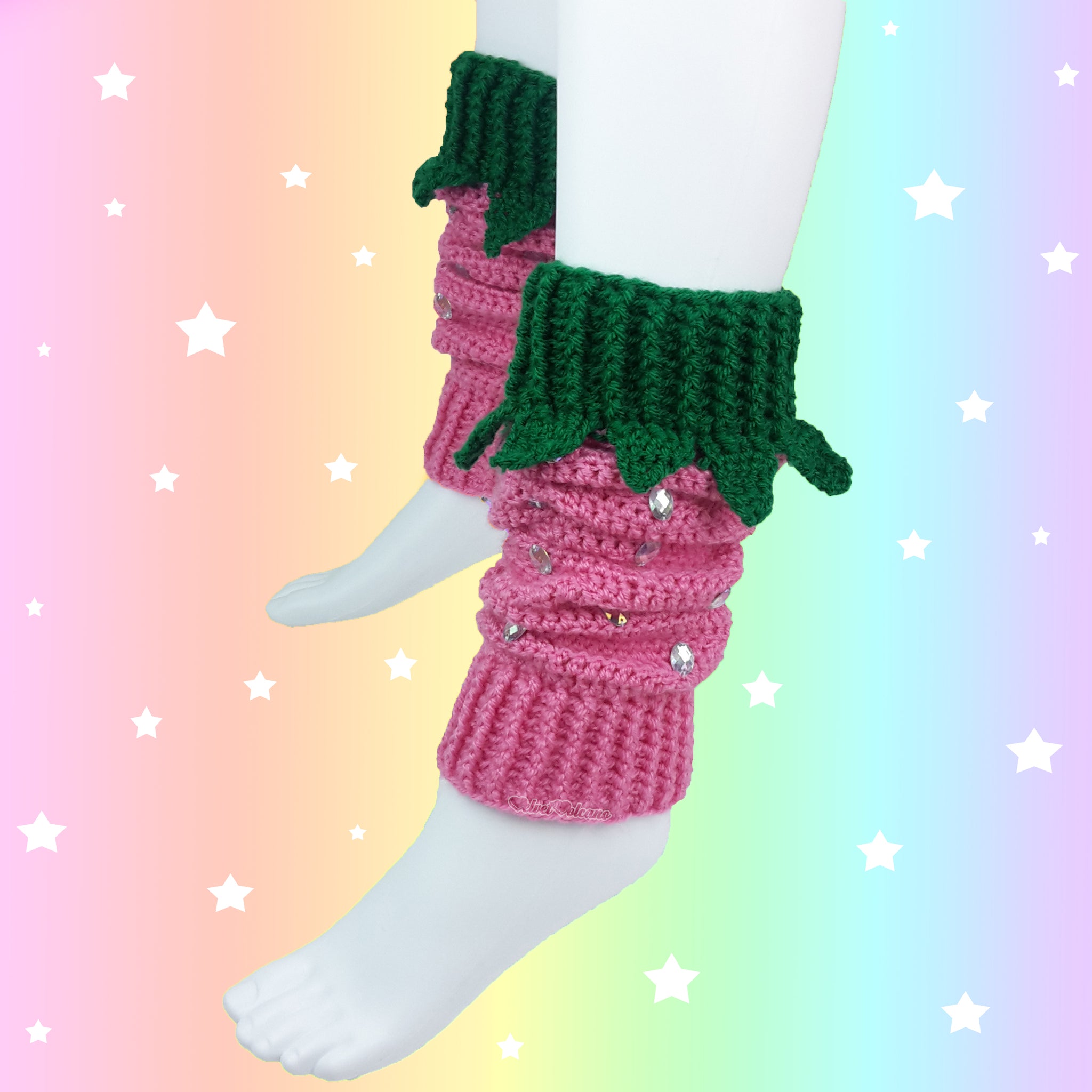 These completely handmade crocheted cuties feature 100% vegan premium acrylic yarn in your choice of colour combination with leaves peaking out from the top cuff PLUS hand-sewn silver rhinestone seeds all the way around for an extra dose of sparkle! ^_^