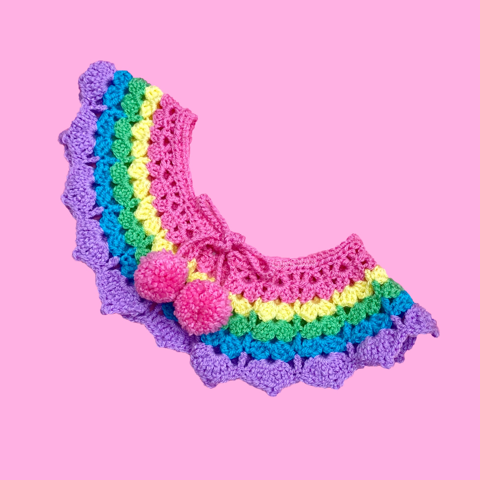 Crocheted from 100% premium acrylic yarn in Bubblegum Pink, Daffodil Yellow, Spearmint Green, Turquoise and Lilac and featuring a lacy chevron type pattern, our Pastel Rainbow removable collar is fastened with bubblegum pink braided ties that end with mini pom poms.